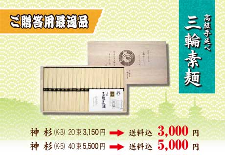 伝統の味、本手延べ三輪素麺をお中元に最適な特別価格にてご提供します。数量に限りがありますので、お早めにお買い求めください。 提供期間: 2013年5月1日〜7月31日 (売り切れの場合は、ご了承ください。)